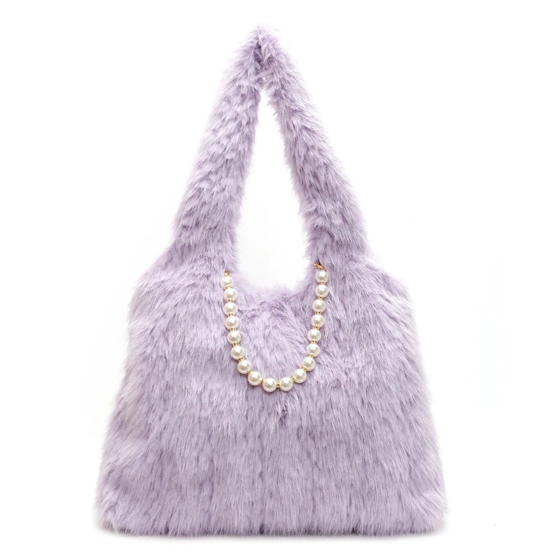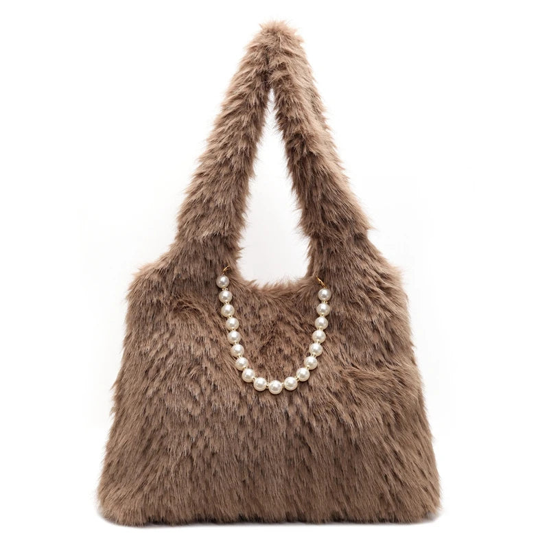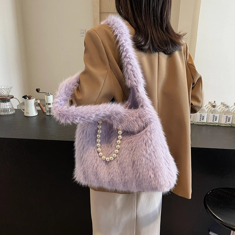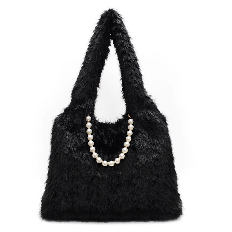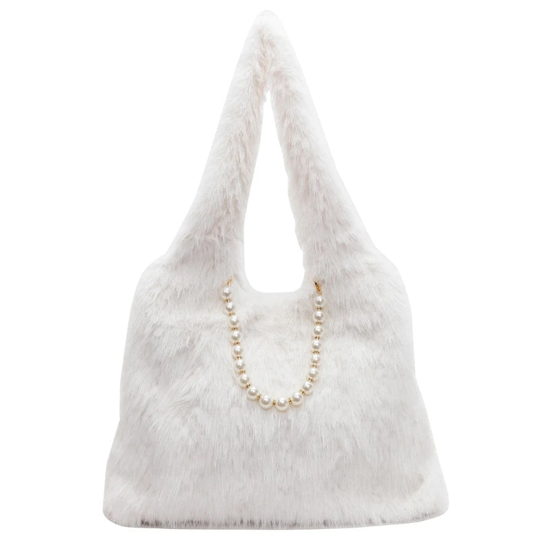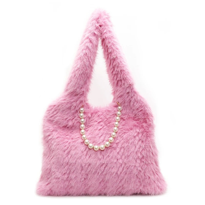 Damen Plüsch Schultertasche – Flauschige Handtasche mit Perlenkette für Alltag & Freizeit