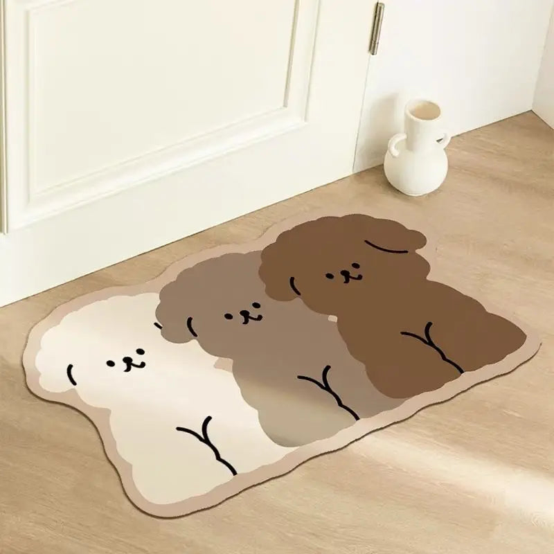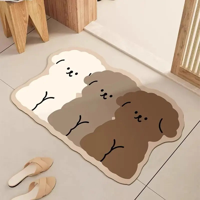Verleihen Sie Ihrem Badezimmer Komfort und Stil mit unserer dreifarbigen Welpen-Badezimmermatte aus Diatomeenerde. Diese rutschfeste und schnell trocknende Bodenmatte kombiniert niedliche Cartoon-Motive mit praktischen Funktionen, um Ihr Zuhause sauber, sicher und gemütlich zu halten. Ideal für Badezimmer, Dusche oder Toilette, sorgt sie dafür, dass Ihre Füße stets trocken und sicher stehen.